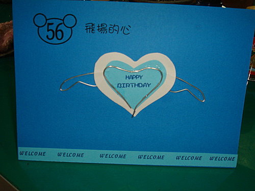 56週年校慶邀請卡。〈剪兩片大小不同,顏色不同得心形,小的愛心紙張先寫上需要的語詞再剪,呎榜和愛心用軟鐵絲摺〉。