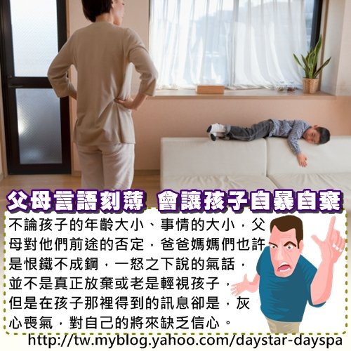 所以,不論孩子的年齡大小、事情的大小,父母對他們前途的否定,爸爸媽媽們也許是恨鐵不成鋼,一怒之下說的氣話,並不是真正放棄或老是輕視孩子,但是在孩子那裡得到的訊息卻是,灰心喪氣,對自己的將來缺乏信心。